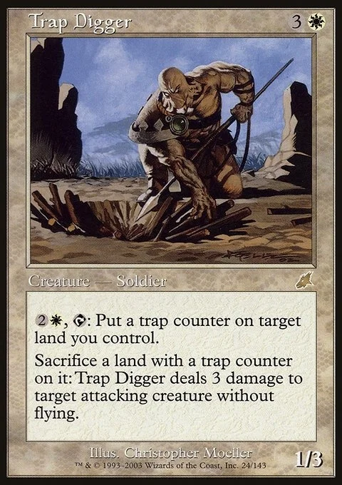 Sacrifice a land with a trap counter on it: Trap Digger deals 3 damage to target attacking creature without flying.
