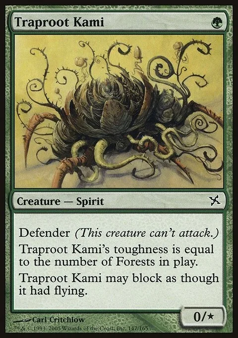 Defender; reach (This creature can block creatures with flying.) Traproot Kami's toughness is equal to the number of Forests on the battlefield.