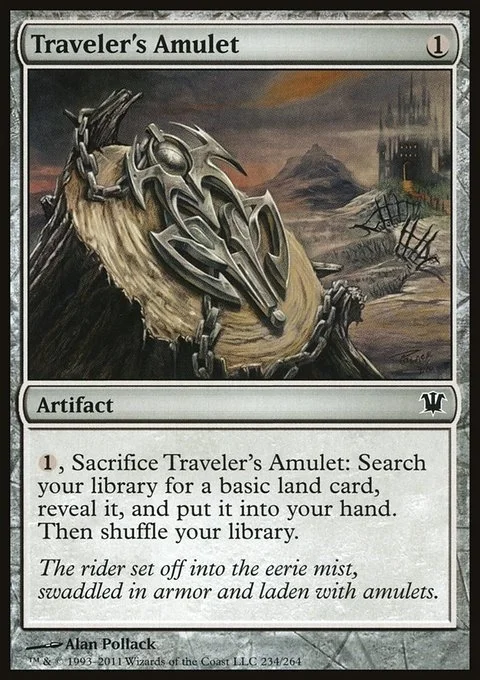 {1}, Sacrifice Traveler's Amulet: Search your library for a basic land card, reveal it, put it into your hand, then shuffle your library.