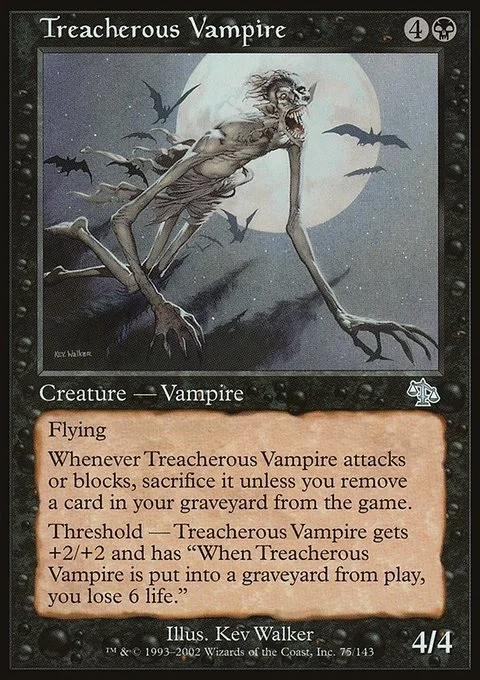 Threshold — As long as seven or more cards are in your graveyard, Treacherous Vampire gets +2/+2 and has "When Treacherous Vampire dies, you lose 6 life."