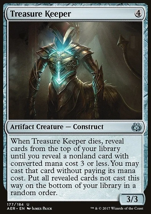 When Treasure Keeper dies, reveal cards from the top of your library until you reveal a nonland card with mana value 3 or less. You may cast that card without paying its mana cost. Put all revealed cards not cast this way on the bottom of your library in a random order.