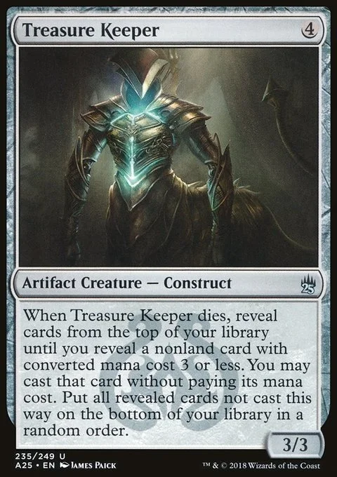When Treasure Keeper dies, reveal cards from the top of your library until you reveal a nonland card with mana value 3 or less. You may cast that card without paying its mana cost. Put all revealed cards not cast this way on the bottom of your library in a random order.