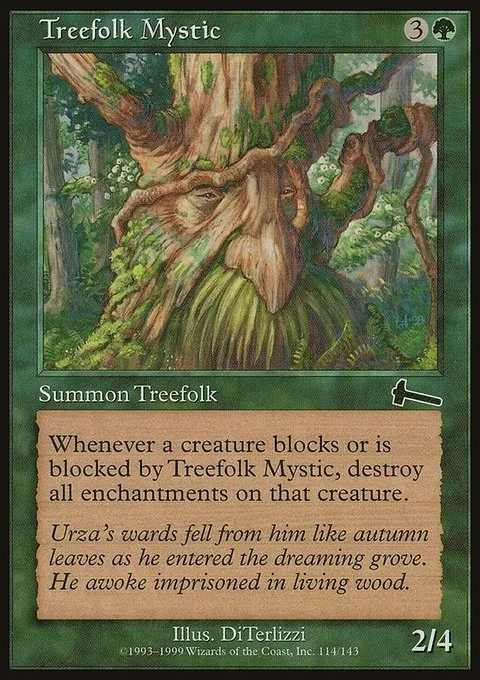 Whenever Treefolk Mystic blocks or becomes blocked by a creature, destroy all Auras attached to that creature.