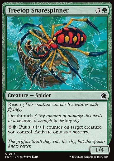 Reach (This creature can block creatures with flying.) Deathtouch (Any amount of damage this deals to a creature is enough to destroy it.) {2}{G}: Put a +1/+1 counter on target creature you control. Activate only as a sorcery.