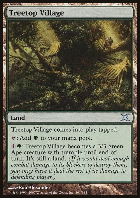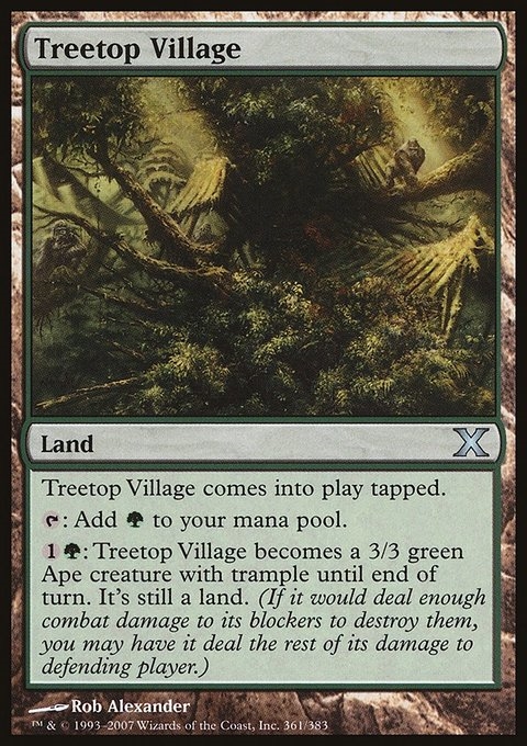 Treetop Village enters the battlefield tapped. {T}: Add {G}. {1}{G}: Treetop Village becomes a 3/3 green Ape creature with trample until end of turn. It's still a land. (It can deal excess combat damage to the player or planeswalker it's attacking.)