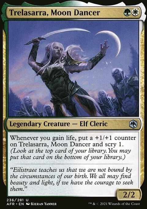 Whenever you gain life, put a +1/+1 counter on Trelasarra, Moon Dancer and scry 1. (Look at the top card of your library. You may put that card on the bottom of your library.)