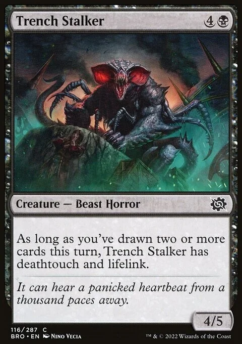 As long as you've drawn two or more cards this turn, this creature has deathtouch and lifelink.