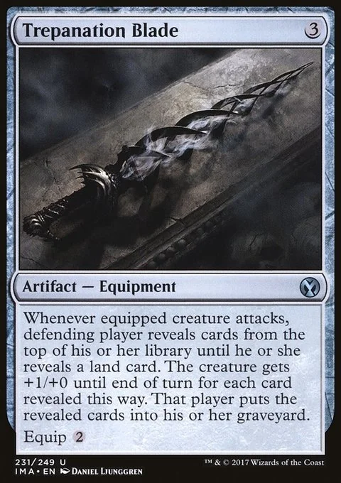 Whenever equipped creature attacks, defending player reveals cards from the top of their library until they reveal a land card. The creature gets +1/+0 until end of turn for each card revealed this way. That player puts the revealed cards into their graveyard. Equip {2}