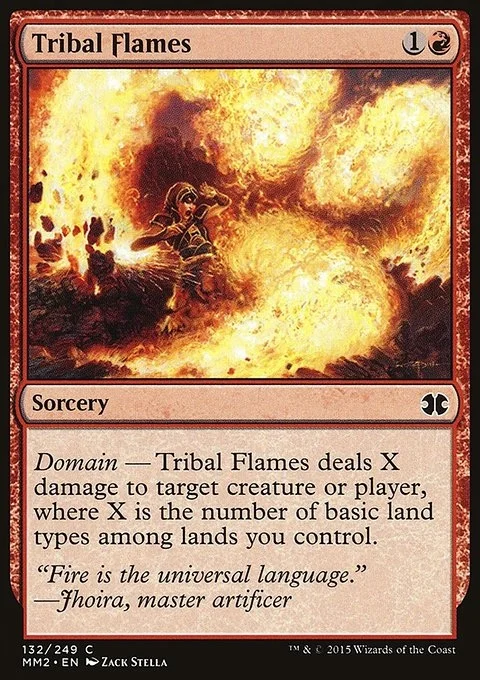 Domain — Tribal Flames deals X damage to any target, where X is the number of basic land types among lands you control.