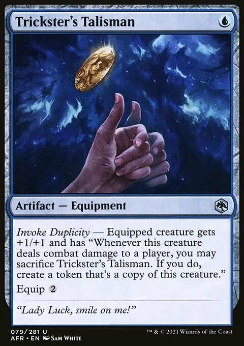 Invoke Duplicity — Equipped creature gets +1/+1 and has "Whenever this creature deals combat damage to a player, you may sacrifice Trickster's Talisman. If you do, create a token that's a copy of this creature." Equip {2}