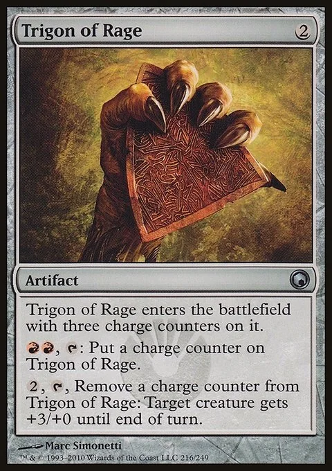 Trigon of Rage enters the battlefield with three charge counters on it. {R}{R}, {T}: Put a charge counter on Trigon of Rage. {2}, {T}, Remove a charge counter from Trigon of Rage: Target creature gets +3/+0 until end of turn.