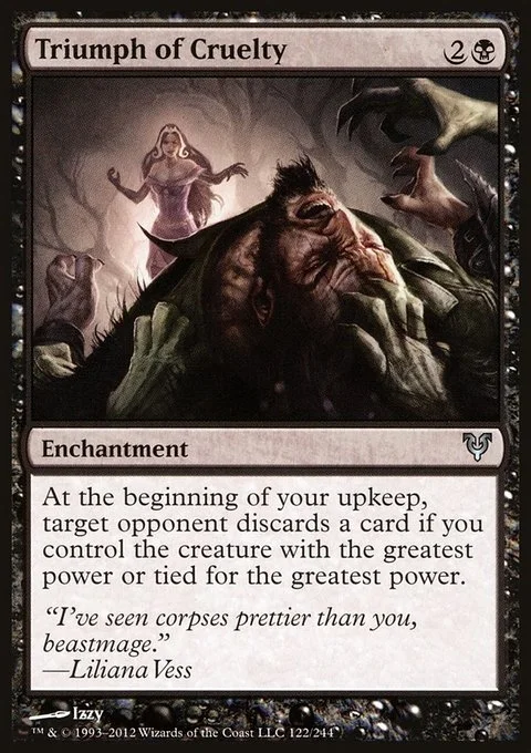 At the beginning of your upkeep, target opponent discards a card if you control the creature with the greatest power or tied for the greatest power.