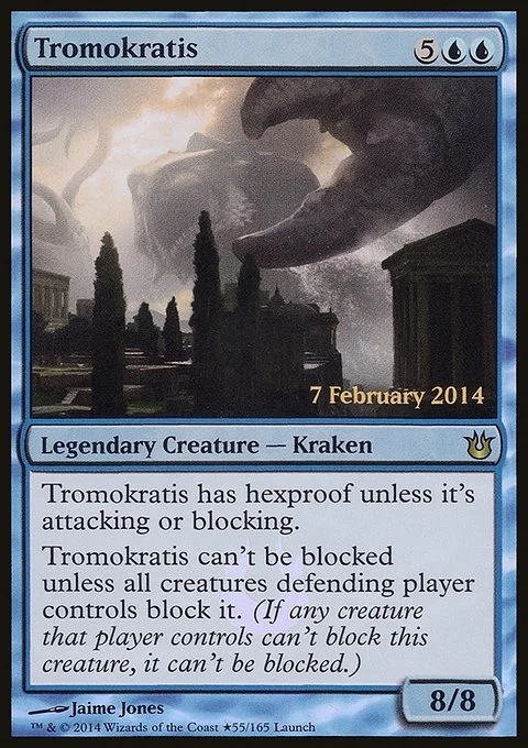 Tromokratis has hexproof unless it's attacking or blocking. Tromokratis can't be blocked unless all creatures defending player controls block it. (If any creature that player controls doesn't block this creature, it can't be blocked.)