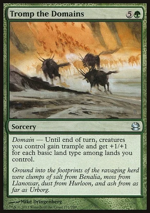 Domain — Until end of turn, creatures you control gain trample and get +1/+1 for each basic land type among lands you control.