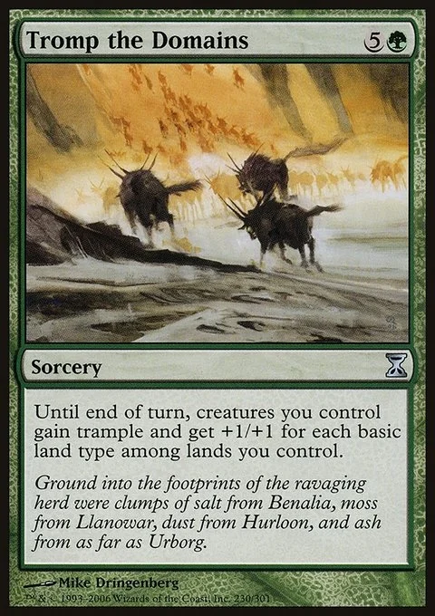 Domain — Until end of turn, creatures you control gain trample and get +1/+1 for each basic land type among lands you control.