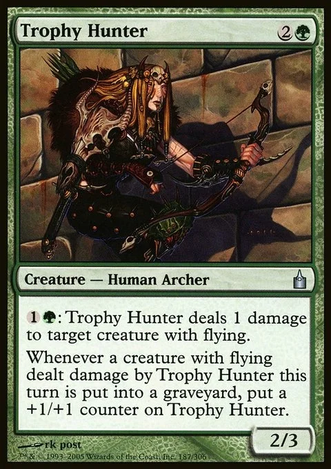 {1}{G}: Trophy Hunter deals 1 damage to target creature with flying. Whenever a creature with flying dealt damage by Trophy Hunter this turn dies, put a +1/+1 counter on Trophy Hunter.