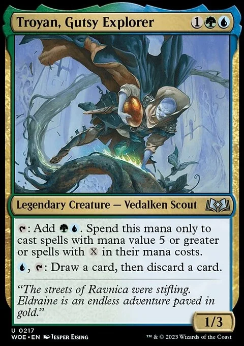 {T}: Add {G}{U}. Spend this mana only to cast spells with mana value 5 or greater or spells with {X} in their mana costs. {U}, {T}: Draw a card, then discard a card.