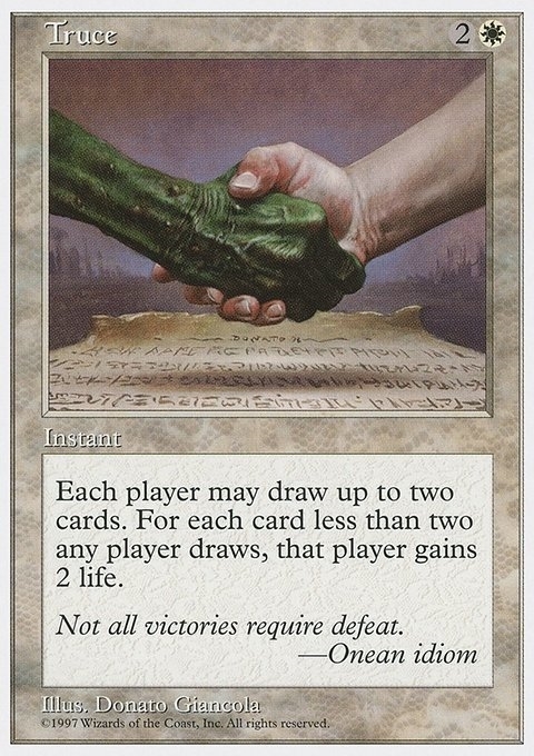 Each player may draw up to two cards. For each card less than two any player draws, that player gains 2 life.