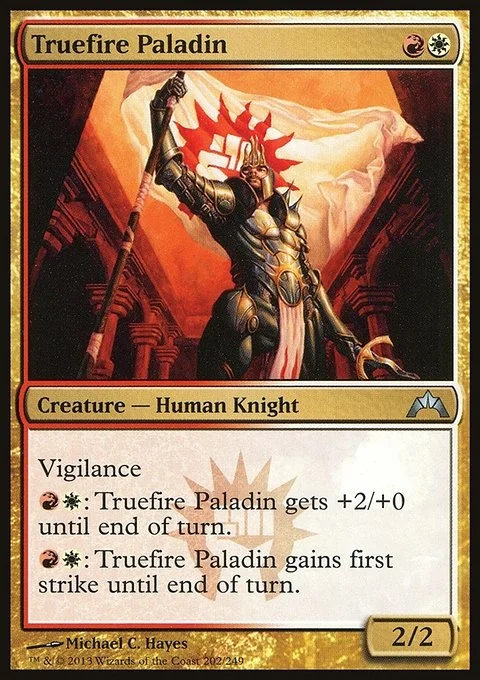 Vigilance {R}{W}: Truefire Paladin gets +2/+0 until end of turn. {R}{W}: Truefire Paladin gains first strike until end of turn.