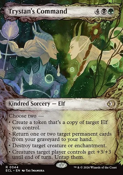 Choose two — • Create a token that's a copy of target Elf you control. • Return one or two target permanent cards from your graveyard to your hand. • Destroy target creature or enchantment. • Creatures target player controls get +3/+3 until end of turn. Untap them.
