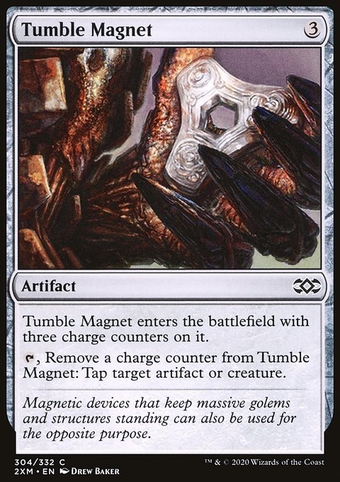 Tumble Magnet enters the battlefield with three charge counters on it. {T}, Remove a charge counter from Tumble Magnet: Tap target artifact or creature.