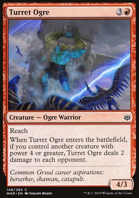 Reach When Turret Ogre enters the battlefield, if you control another creature with power 4 or greater, Turret Ogre deals 2 damage to each opponent.