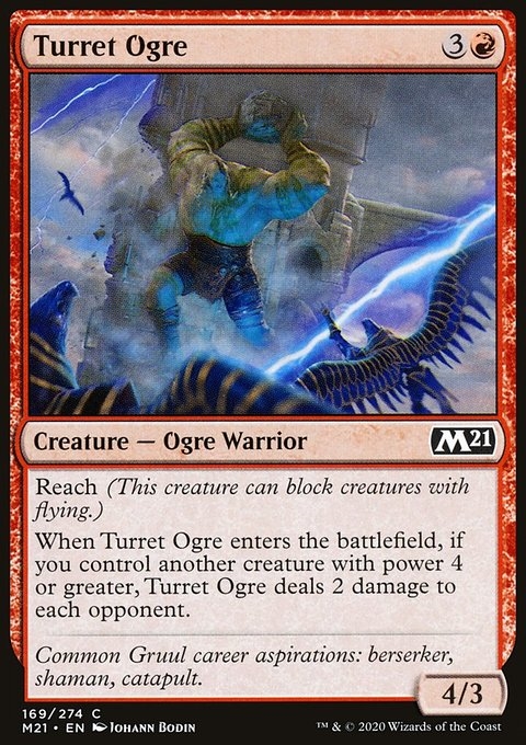Reach (This creature can block creatures with flying.) When this creature enters, if you control another creature with power 4 or greater, this creature deals 2 damage to each opponent.