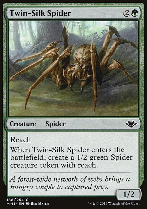 Reach When this creature enters, create a 1/2 green Spider creature token with reach.