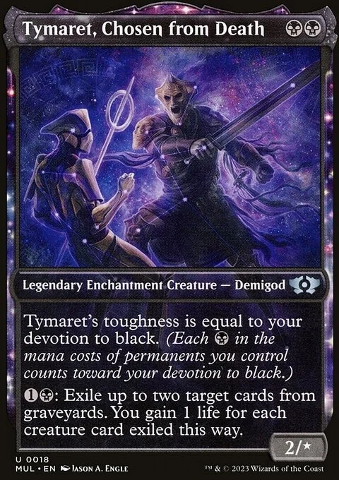 Tymaret's toughness is equal to your devotion to black. (Each {B} in the mana costs of permanents you control counts toward your devotion to black.) {1}{B}: Exile up to two target cards from graveyards. You gain 1 life for each creature card exiled this way.