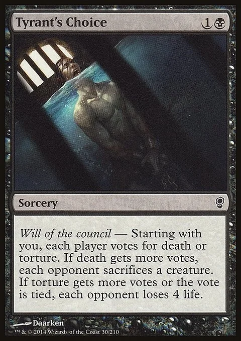 Will of the council — Starting with you, each player votes for death or torture. If death gets more votes, each opponent sacrifices a creature. If torture gets more votes or the vote is tied, each opponent loses 4 life.