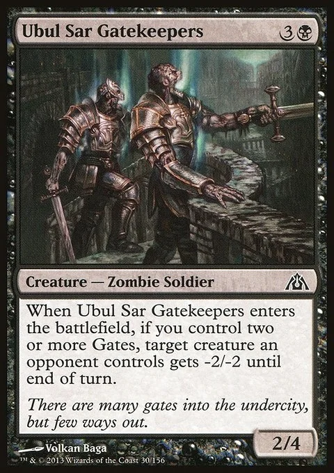 When Ubul Sar Gatekeepers enters the battlefield, if you control two or more Gates, target creature an opponent controls gets -2/-2 until end of turn.