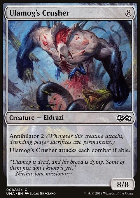 Annihilator 2 (Whenever this creature attacks, defending player sacrifices two permanents.) Ulamog's Crusher attacks each combat if able.