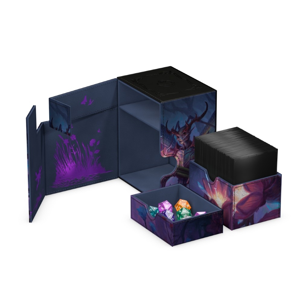 The Flip'n'Tray 133+ Xenoskin is a high-quality TCG deck box that offers premium card protection thanks to its resistant Xenoskin material, microfiber inner lining, and strong magnetic closure. The deck box has an integrated and removable accessory tray for dice that can be accessed independently, and is printed in full color with officially licensed artworks from Magic: The Gathering’s upcoming set "Lorwyn Eclipsed". The Flip’n’Tray 133+ Xenoskin is optimized to hold 133 double-sleeved or 160 single-sleeved cards in Ultimate Guard sleeves.