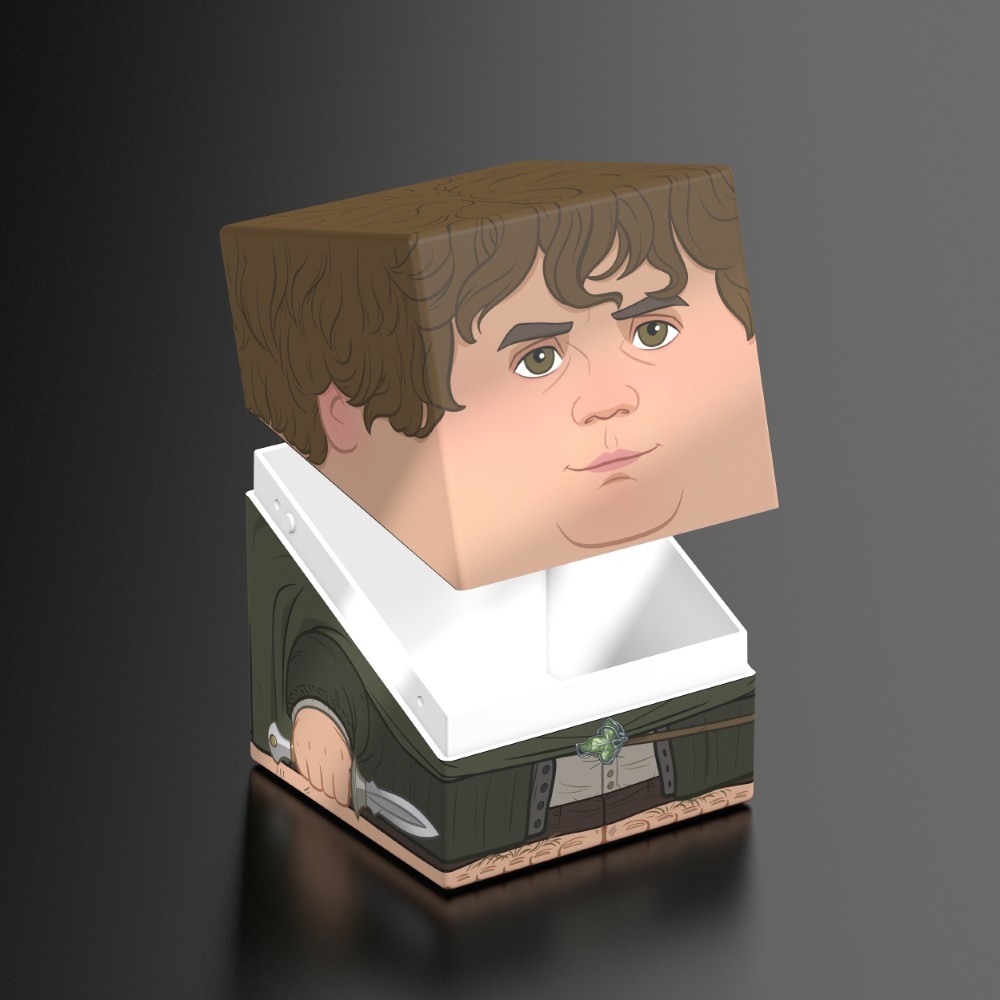 Collectible box for storing TCG decks, tabletop gaming accessories, and/or collectibles. The Sam Squaroe from the The Lord of the Rings edition holds up to 100 cards in double protective sleeves if used as a deck box. Squaroes are made from 78% renewable resources and fit perfectly into the separately available Collectors Case.