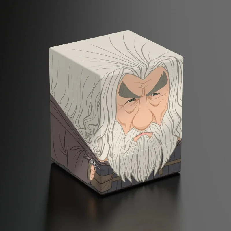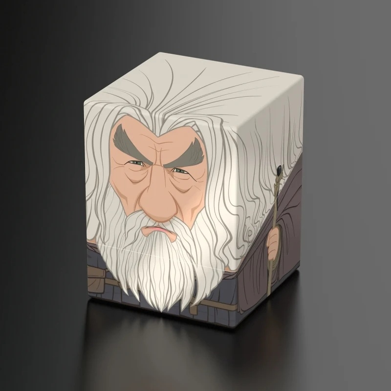Collectible box for storing TCG decks, tabletop gaming accessories, and/or collectibles. The Gandalf the Grey Squaroe from the The Lord of the Rings edition holds up to 100 cards in double protective sleeves if used as a deck box. Squaroes are made from 78% renewable resources and fit perfectly into the separately available Collectors Case.