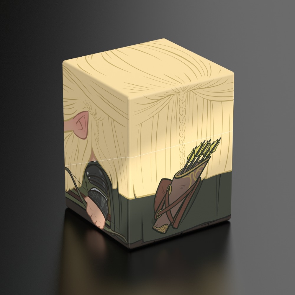 Collectible box for storing TCG decks, tabletop gaming accessories, and/or collectibles. The Legolas Squaroe from the The Lord of the Rings edition holds up to 100 cards in double protective sleeves if used as a deck box. Squaroes are made from 78% renewable resources and fit perfectly into the separately available Collectors Case.