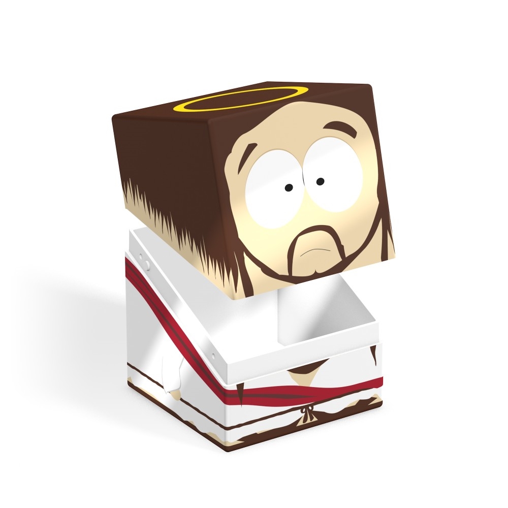 Collectible box for storing TCG decks, tabletop gaming accessories, and/or collectibles. The Jesus Squaroe from the South Park edition holds up to 100 cards in double protective sleeves if used as a deck box. Squaroes are made from 78% renewable resources and fit perfectly into the separately available Collectors Case.