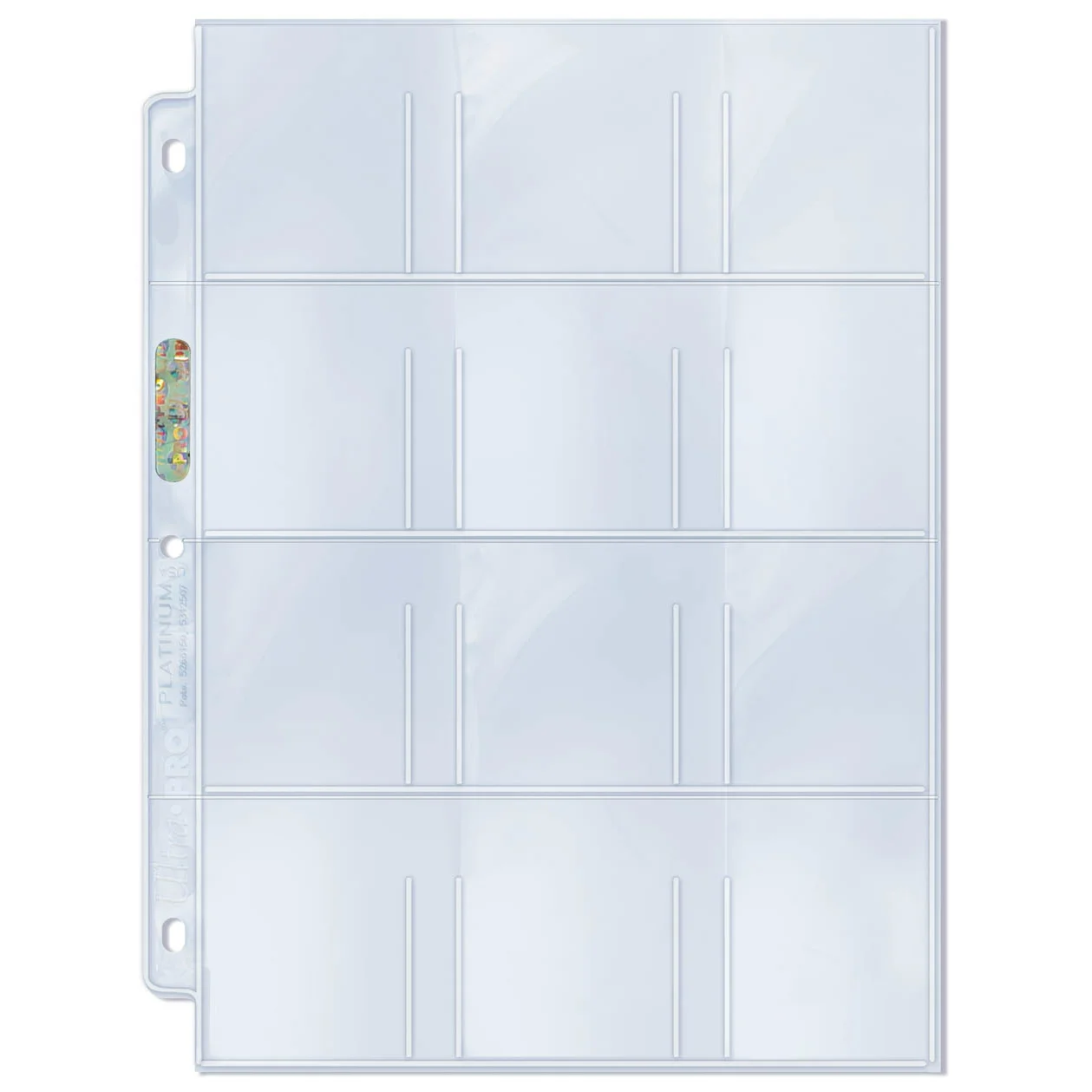 Ultra PRO Platinum Hologram Pages in twelve-pocket style. Archival quality pages that holds stickers and cards 2-1/4" X 2-1/2" or smaller; ideal for stickers, tags, small cards and other collectibles and memorabilia. Pages are clear on both sides and fit in our standard-size 3-ring albums.