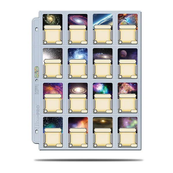 16-pocket page with configuration of four rows of four pockets per row. Archival quality pages are ideal for cards in Mini American Board Games Sleeves. Pages are clear on both sides and fit in our standard-size 3-ring albums.
