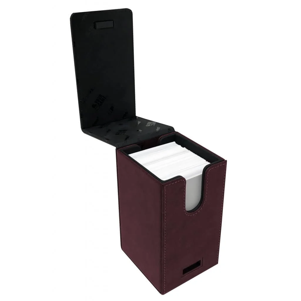 The Alcove Tower Deck Box can hold up to 100 double sleeved cards with its lid secured by strong magnetic closures utilizing multiple magnets for extra protection.