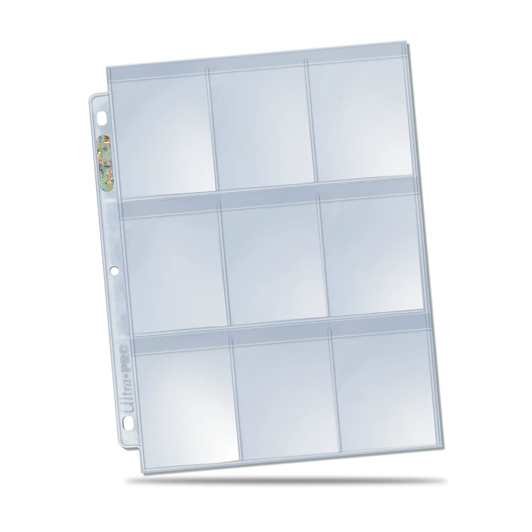 Ultra PRO Platinum Hologram Pages in nine-pocket style with a protective flap for each pocket to secure cards in and keep dust & dirt out. Archival quality pages that holds standard-sized cards with 2-1/2" X 3-1/2" dimensions or smaller. Also ideal for sticker cards, coupons and other collectibles. Pages are clear on both sides and fit in our standard-size 3-ring albums.