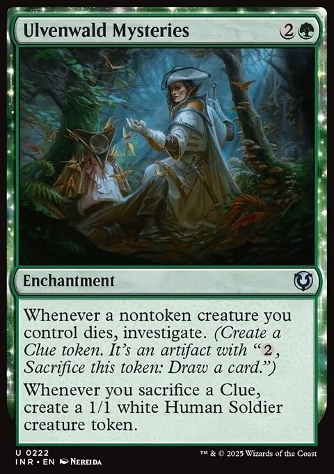 Whenever a nontoken creature you control dies, investigate. (Create a Clue token. It's an artifact with "{2}, Sacrifice this artifact: Draw a card.") Whenever you sacrifice a Clue, create a 1/1 white Human Soldier creature token.