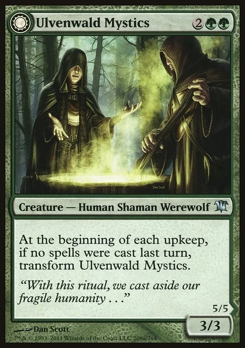 At the beginning of each upkeep, if no spells were cast last turn, transform Ulvenwald Mystics.