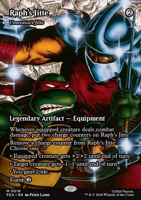 Whenever equipped creature deals combat damage, put two charge counters on Umezawa's Jitte. Remove a charge counter from Umezawa's Jitte: Choose one — • Equipped creature gets +2/+2 until end of turn. • Target creature gets -1/-1 until end of turn. • You gain 2 life. Equip {2}