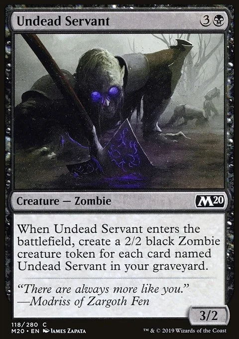 When this creature enters, create a 2/2 black Zombie creature token for each card named Undead Servant in your graveyard.