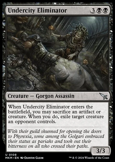 When Undercity Eliminator enters the battlefield, you may sacrifice an artifact or creature. When you do, exile target creature an opponent controls.