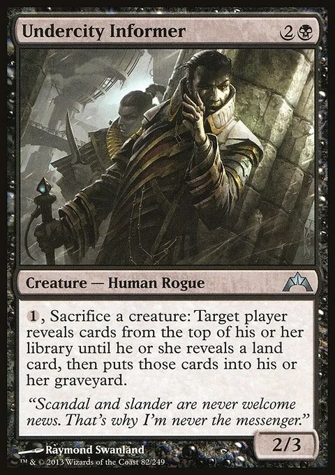 {1}, Sacrifice a creature: Target player reveals cards from the top of their library until they reveal a land card, then puts those cards into their graveyard.