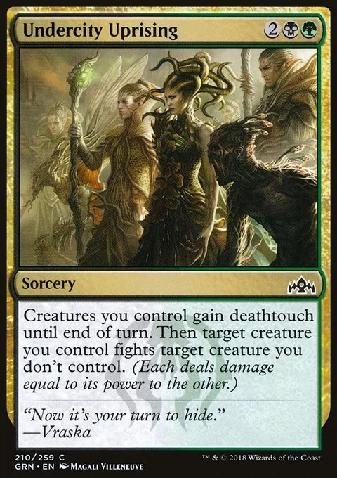 Creatures you control gain deathtouch until end of turn. Then target creature you control fights target creature you don't control. (Each deals damage equal to its power to the other.)