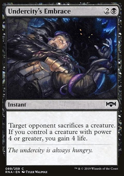 Target opponent sacrifices a creature of their choice. If you control a creature with power 4 or greater, you gain 4 life.