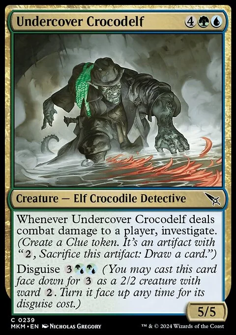 Whenever this creature deals combat damage to a player, investigate. (Create a Clue token. It's an artifact with "{2}, Sacrifice this token: Draw a card.") Disguise {3}{G/U}{G/U} (You may cast this card face down for {3} as a 2/2 creature with ward {2}. Turn it face up any time for its disguise cost.)
